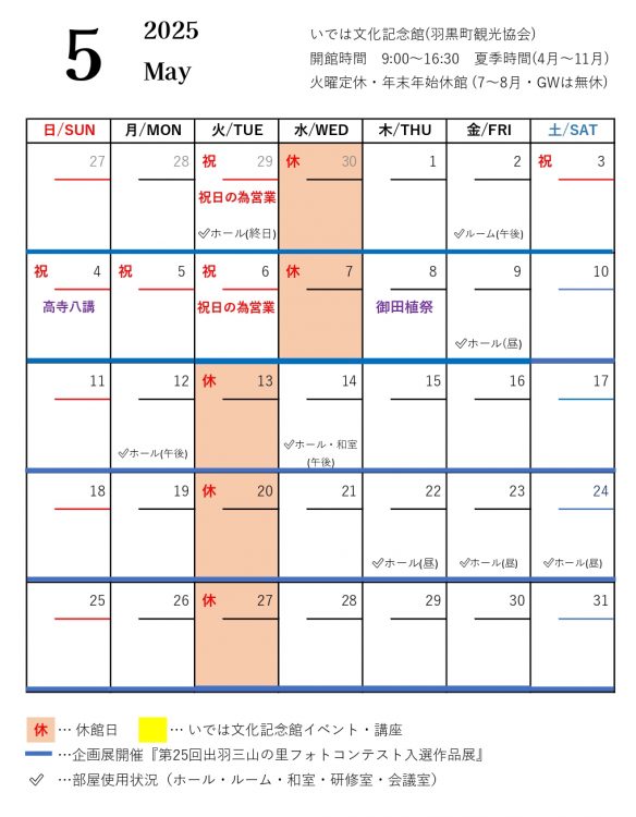 いでは文化記念館の5月の開館カレンダーのお知らせです。