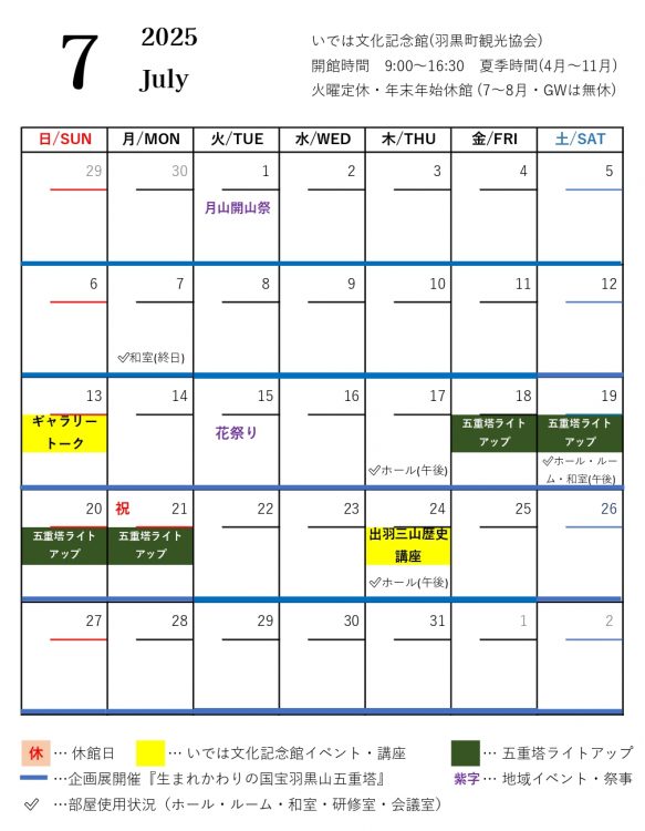 いでは文化記念館の7月の開館カレンダーのお知らせです。