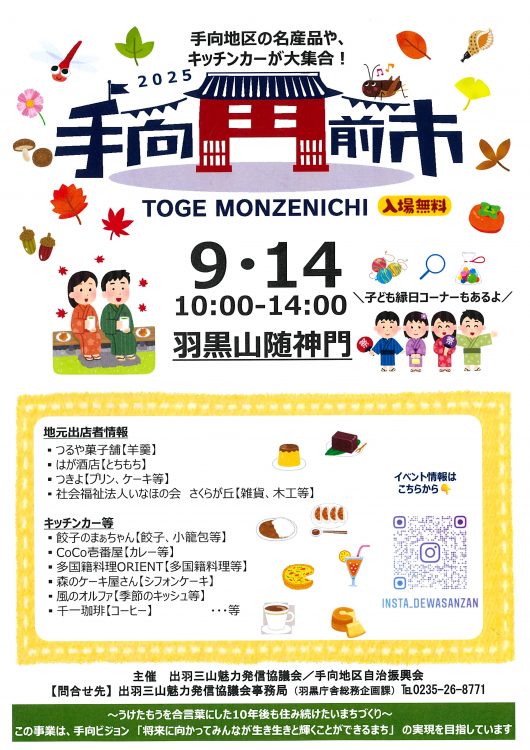 手向地区の名産品やキッチンカーが集合するマルシェイベント。今回は羽黒山随神門での開催です。