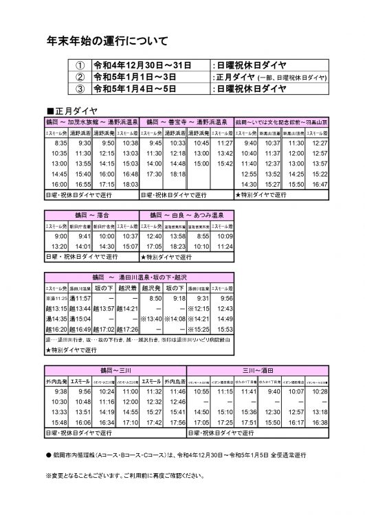 年末年始の路線バスの運行情報が庄内交通から発表されました。